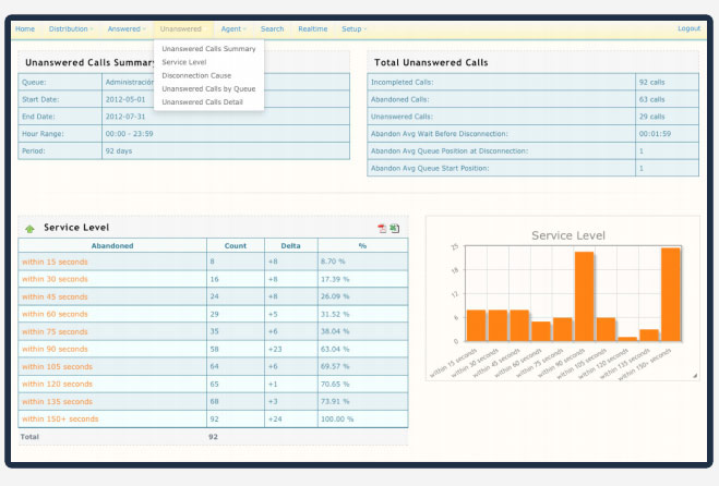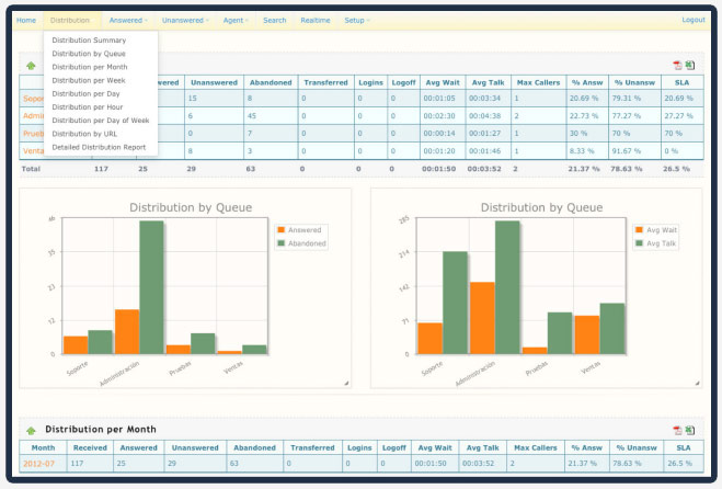 Real-time statistics, call details, customizable graphics and call monitoring to take full control over the agents.